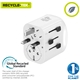 Con este adaptador puedes cambiar de enchufe en un segundo y poder conectar el dispositivo electrónico que prefieras. El adaptador admite enchufes tipo A/B/I/G/L y puede enchufarse en tomas de corriente de tipo B/G/I/F/E. Con un packaging ecoresponsable, con tinta orgánica y pegamento sostenible nos preocupamos por el medio ambiente y utilizamos plástico reciclado certificado en la fabricación de nuestros accesorios.