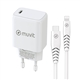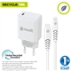 Pack muvit for Change que incluye un cargador de pared con clavija europea de un elegante diseño patentado. Está fabricado con material reciclado y pensado en 2 piezas para facilitar su reciclaje al final de su vida útil. Dispone de 1 puerto USB tipo C de 20W de potencia más un cable para carga y transferencia de datos con conector tipo C a lightning 3A, para proporcionarte una carga más rápida. Compatible con cualquier iPhone (a partir de iPhone 5). 1,2m de longitud, en color blanco y 100% reciclable.