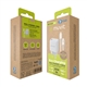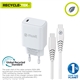 Nuestro Pack muvit for Change que incluye un cargador de pared con clavija europea de diseño fino, está fabricado con material PC 100% reciclado (certificado GRS) y 100% reciclable. Dispone de 1 puerto USB-Tipo C 30W de potencia carga rápida, más un cable con material TPE (certificado GRS) y 100% reciclable para carga y transferencia de datos con conector tipo C a tipo C, 3A de 1m de longitud, color blanco.